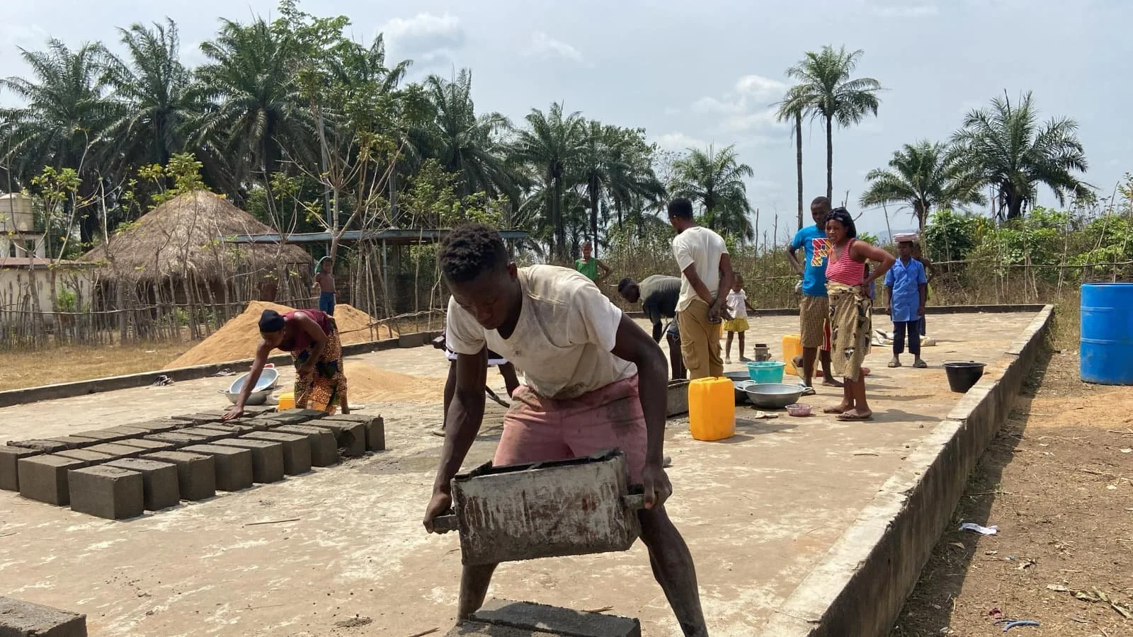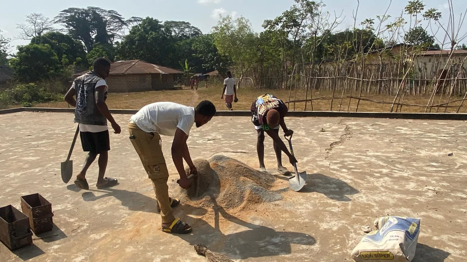 📷 Photo 1 — Volunteers and community members mixing sand in Foindu Village, preparing the bricks building for the Vocational Skills Training Center.